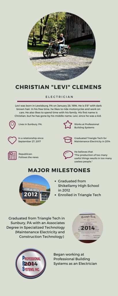 I thought about what types of things to do all week before actually doing the infographic. Since my boyfriend is an Electrician, I wanted to make sure I added the parts of his career and how he got there. I wanted it to be simple, yet sophisticated in case I decide to turn it into a resume infographic one day. He is a pretty simple guy, so I wanted to make sure I represented that in the profile.