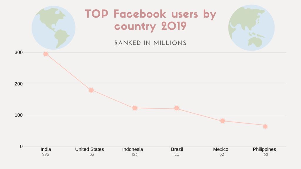 For this assignment, I made both of my graphs through Canvas. My statistics came from https://www.statista.com/statistics/268136/top-15-countries-based-on-number-of-facebook-users/. I did start from scratch with both of my designs. I love using Canvas, the network allows me to make anything I can imagine. Canvas allows me to make any design I want which can result in a cool design. I am interested in social networks so I looked for my statistics on Google. This project took me a week since I originally designed two graphs on an infographic. For my design process, I thought I’d make two completely different designs that have different colors, script, and photographs.