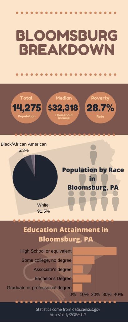 To create this graphic, I used the program Canva. I chose a template to give me an idea on how to space out the information but changed the fonts, colors, pictures and even the layout to my liking. I didn’t know what topic to make my graphs around but after looking through the resources, I decided I wanted to take a closer look at who makes up the town of Bloomsburg. In total, this project took me a little over an hour after I decided on the topic and information I wanted to include. Once I had a topic and a layout, I began to input the data and charts and change the color scheme around. I always get the codes for my colors by searching up color schemes on Pinterest.