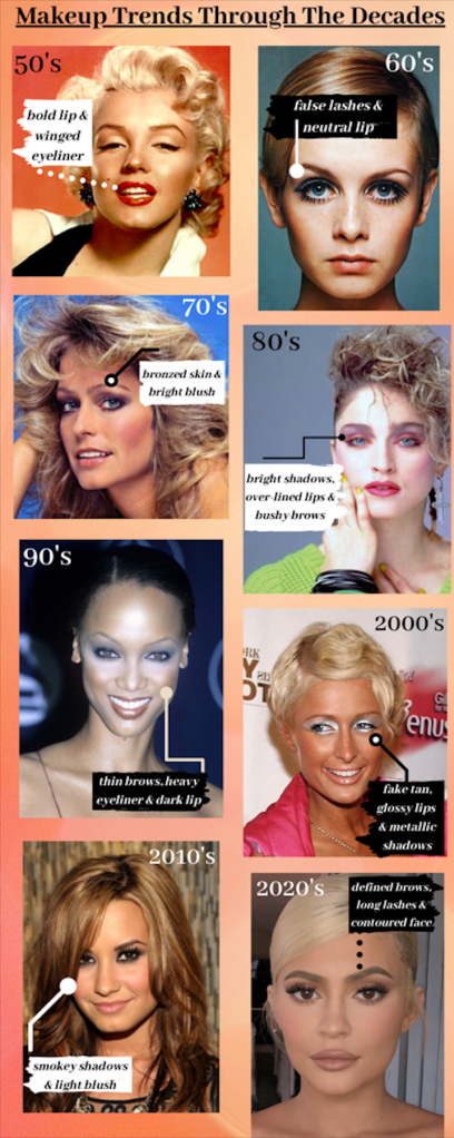 I’d like to consider myself pretty educated on the (recent) history of makeup, so most of my research consisted of finding the right images to display that generation’s makeup looks. I did run into some roadblocks when trying to find accurate representations of makeup from the fifties to eighties. It was fun to see how certain generations makeup looks overlapped with some iconic looks from the past. I also enjoyed learning about just how many women in the entertainment industry informally shaped our makeup world as we know it.