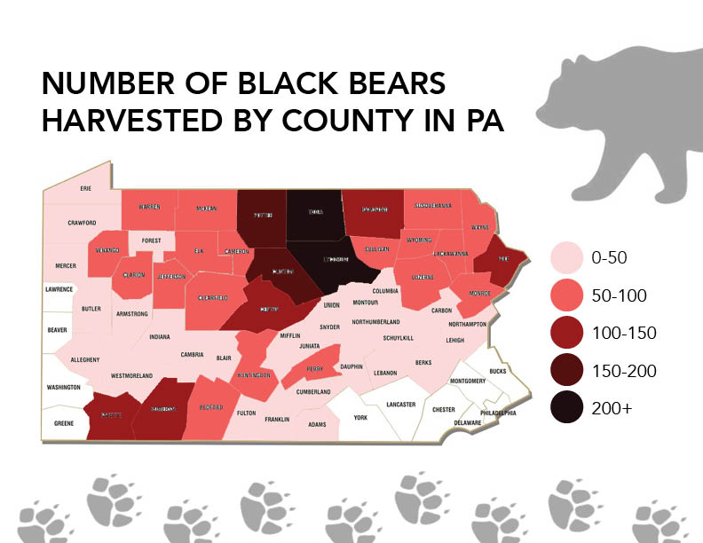 For this weeks infographic, I created a map of all the counties in Pennsylvania and how they stack up against one another when it comes to the number of black bears harvested. This assignment was relatively easy to create the actual map after I had all of my data collected. Gathering all of the data itself and actually figuring out which counties had to be in which category was relatively challenging and just very time consuming, I spent time two different days working on this map. One day spent researching the data, and writing down the numbers for each county, the other day to actually construct the map. I got the data through an image I found on lancasteronline.com and then used a different image for my template to add the colors to (co.lawrence.pa.us/pennsylvania-county-websites/). I used Photoshop to add the colors to the map, and then exported that image and opened it in InDesign to create the actual document. The colors I chose were pretty random, I found the color palette on Adobe Color, and just liked the colors. I also found some vector images of a bear and some bear paws on google that I incorporated into my design.