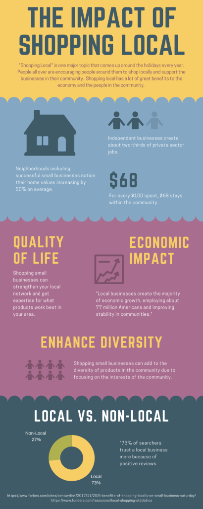 Once again, I used canva for this assignment. I used a template this time to organize my thoughts. I always like how simple this program is to work with. I was brainstorming ideas that weren’t so obvious in todays news. Then the idea popped into my head to do the effects of shopping local. It probably took me an hour or two altogether to research and then put it all together. I left the colors from the original template because I think they are bright and fun. They seemed fitting to the topic. I also wanted to keep everything clean and basic so it isn’t overkill with information and graphs.