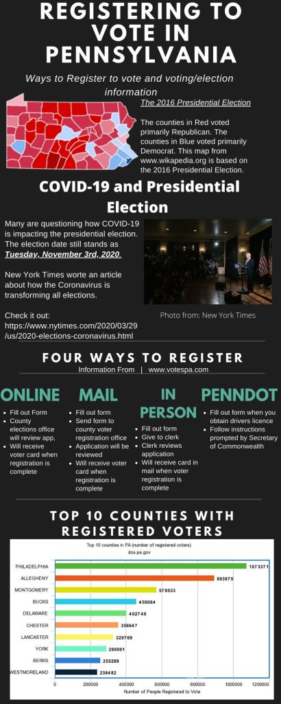 Creating this infographic, I kept in mind what is happening in the world. I chose to show the counties who were primarily Republican and Democrat in the 2016 Presidential Election. I then moved to showing an article from New York Times, to discuss how the COVID-19 pandemic is affecting the 2020 Presidential Election. I moved on to discussing how to register to vote. Lastly, I showcased the Top 10 PA counties that are registered to vote already.