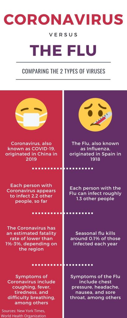 For this week’s topic, I chose to do the CoronaVirus vs the flu. I just put a few quick facts for each. For this infographic, I used Canva and I picked a template. I kept the colors the same I just changed the information and the pictures. This only took about 10 mins to accomplish since it was very little information, since there isn’t much concrete information yet about the virus.
