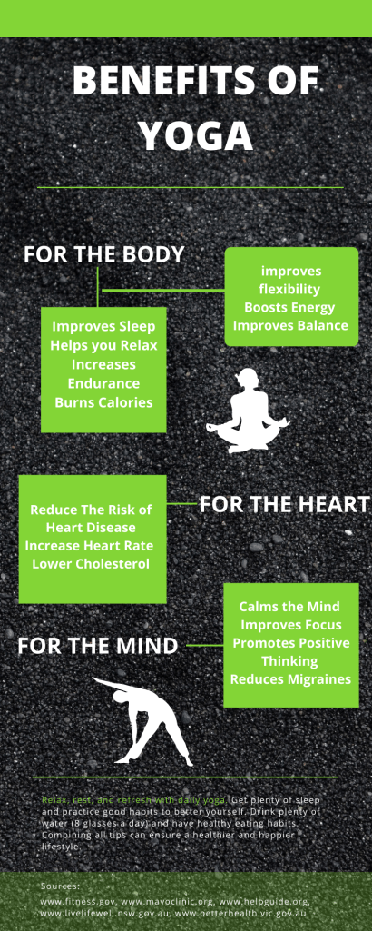 For this weeks infographic i decided to write about the health benefits of yoga. I chose this because I am currently enrolled in a yoga class at Bloomsburg and it made me realize how much I enjoy it. So I wanted to share all the benefits. To make this infographic I used Canva. I designed my own colors, background, and fonts. Along with playing shapes to make the bubbles under the text and the lines to connect them. I decided to focus on the mind, heart, and body and share some benefits that coordinate with them. I also inserted some yoga pose pictures also from Canva.