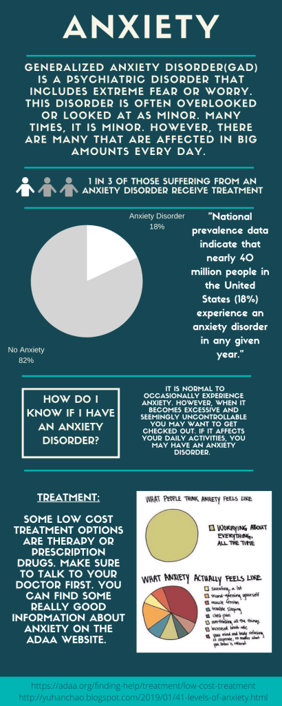 This week, I wasn’t really sure what to do. I decided to do an infographic on anxiety because it is something I have dealt with all of my life. I used a canva template but ended up clearing it off anyway. I looked up anxiety and found the anxiety disorder website. I used this website for all of my information on the infographic. it probably took me about an hour and a half to research my topic and then create the infographic. I kept the colors as a dark teal and teal because it looked good together. I tried to keep all of my information uniform. Overall, I think this one went pretty good and I got it done in a timely manner.