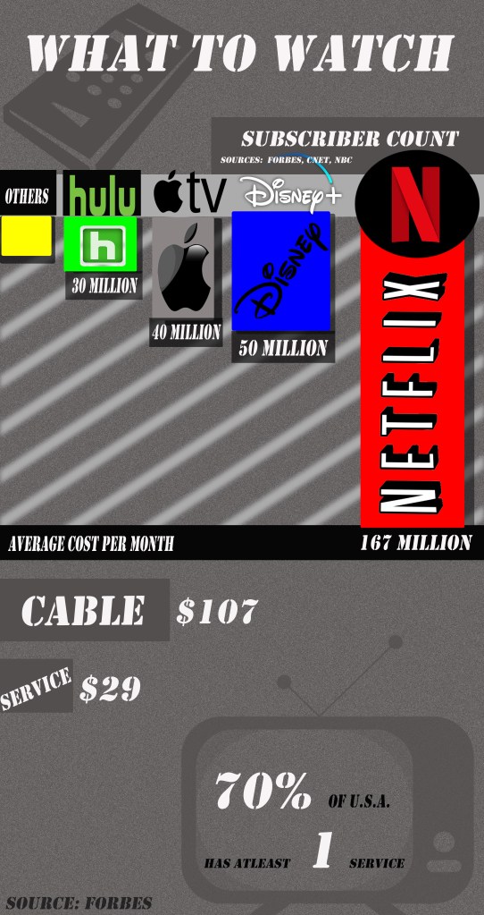 It was also interesting to point out that 70% of Americans have at least one streaming service they watch. However, the average American watched 3.4 Different services (FORBES).