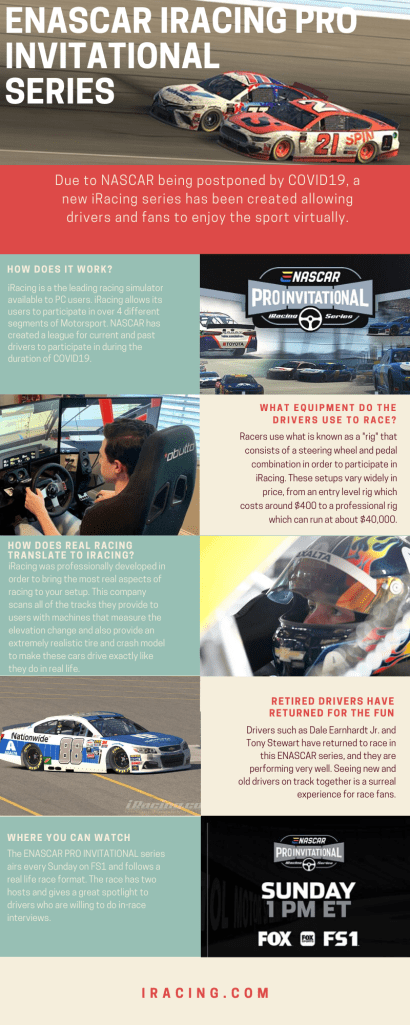 With the shutdown of nearly all sports across the world due to COVID19 we are left with very few sources of live entertainment. NASCAR took to the virtual side of racing in order to keep creating media and entertain the masses. The ENASCAR Pro Invitational Series has taken off since its debut last month, as millions of viewers now tune in to watch the race every Sunday. For this info graphic I chose to give canva a try. The amount of templates I had access too was amazing and I found this one to start with. With some slight modification to text, font, and the addition of photos I think it came out great. This info graphic would be a great lead in on social media for new viewers to discover what this virtual series is about.