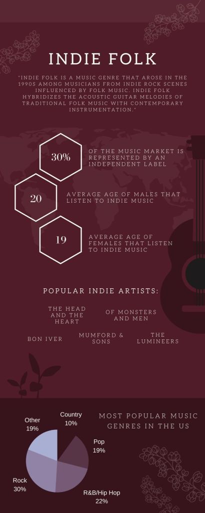 For this weeks infographic, I chose to create a graphic about one of my favorite genres of music, indie folk. I chose this topic, because none of my other previous infographics were related to this, and it is something that I enjoy talking about. I chose to create this infographic in Canva, because I just really liked this template and I thought it would fit the vibe I wanted to create in my design. I like the clean look of it, and the darker colors it used. I researched to find some statistics on this specific genre of music, and used websites like digitalmusicnews.com and wikipedia.com. I created my simple pie chart in Canva, and found some cool graphic elements to incorporate in my infographic. I enjoyed this week’s topic, but I wish I wouldn’t have procrastinated and gave myself a little bit more time to be creative and do more intensive research.