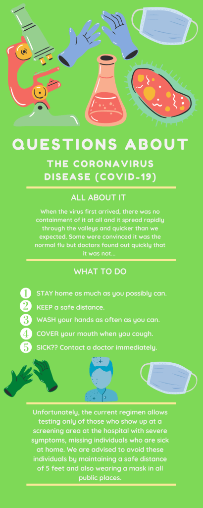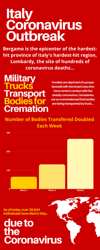 For these infographics, I pretty much began as I usually would but before I started them, I really read through the story about the Italy Coronavirus Outbreak and took the most important chunks of the story that I thought were essential and split them up into three different subjects for three individual infographics. I used the program Canva.com to complete all three of the infographics as the templates they had really got me going with each topic and made it easier to fill in the information from the story as I go. I began with a template for each infographic as always but they changed drastically by the time I was done filling in all my information. The elements of the story that really caught my attention were all the death numbers that were given and how terrible this coronavirus really is. Individuals are unable to grieve their loved ones properly and it is a very hard time for some people to live in. I tried to enhance the important points with my infographics by really emphasizing the numbers and scaring viewers into seeing how serious the epidemic could still become if we don’t get serious.