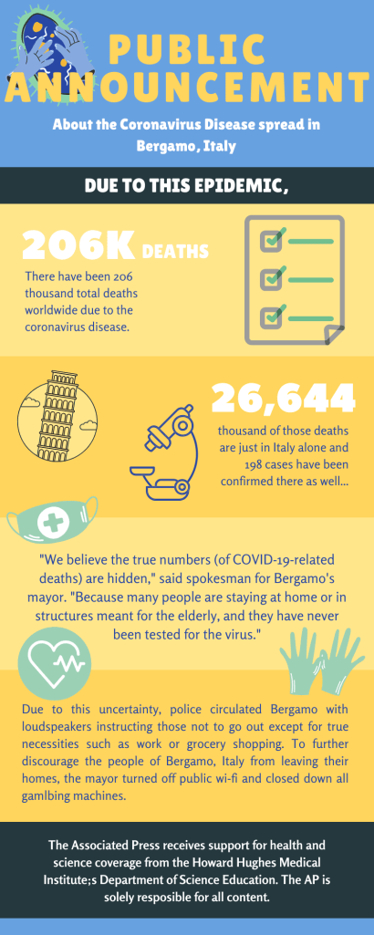 I researched the topic for a short period after reading the story just to see the total number of deaths worldwide to compare to the numbers in Italy and also to see how the numbers have changed since this story was released. Looking it up on Google is the best way to get numbers that I know of because the number changes every second as it does in real life. It took me about 2 hours to create all three infographics about the story and put full detail into making them grab the world’s attention. My design process began by choosing a good paragraph or two to work with and then adding the information from those paragraphs to my infographics but in a more visually appealing way. You could do this with bold text, images, and even graphs to display data and proof of how terrible this is truly getting. I stuck with the same color scheme for each individual infographic and was very pleased with how each individual one came out.