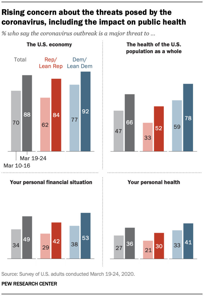 In the graphic below, we see that there is a concern for the economy, health population, financial solution, and personal health. The Pew Research Center wanted to analyze the main concerns that millions of Americans have. (All graphs in this article is from the Pew Research Center) According to the article, Coronavirus: Why systemic problems leave the U.S. at risk, they state “As the coronavirus spreads across the US, tens of millions of Americans may not seek medical help either because they are uninsured or undocumented. That puts everyone in society at greater risk” (Maqbool, 2020). We know that these concerns are present within the United States, but we didn’t talk about these issues occurring. This is the first time I have seen the concern for this issue arise. If this would be discussed, it would be a political argument. The point I wanted to highlight within this infographic is that it is grouped by Republicans versus Democrats and each parties’ concerns. This is odd to me because it makes no sense that they have to list this versus that. Why can’t it be one general survey that we have showcasing our biggest issues and the amount of concern for each. I feel this is just making one party look like they care more than the other about certain issues.