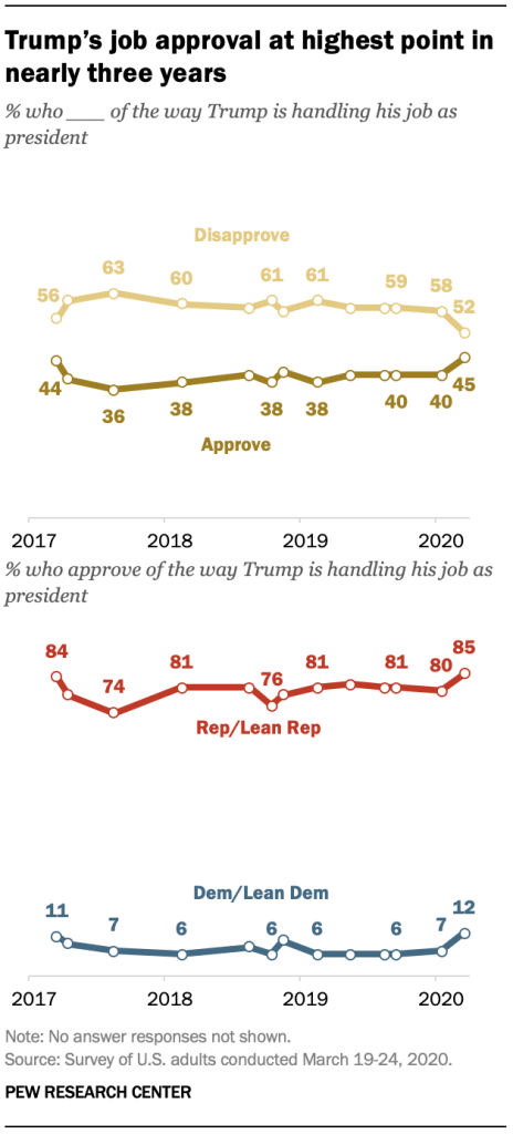 Lastly, in the chart below, we see it is about how the political parties are approving how Trump is doing his job. They are showing that it is the highest it has been in three years. This is something that really shows how politics is a huge part of what we are hearing about the virus. This is important that Trump is doing something but why is this a focus? The take away of this whole article is that politics are really playing a roll in the coronavirus where our main focus needs to be how can we help slow the spread and try and keep us safe and healthy while figuring how we can return back to our everyday lives.