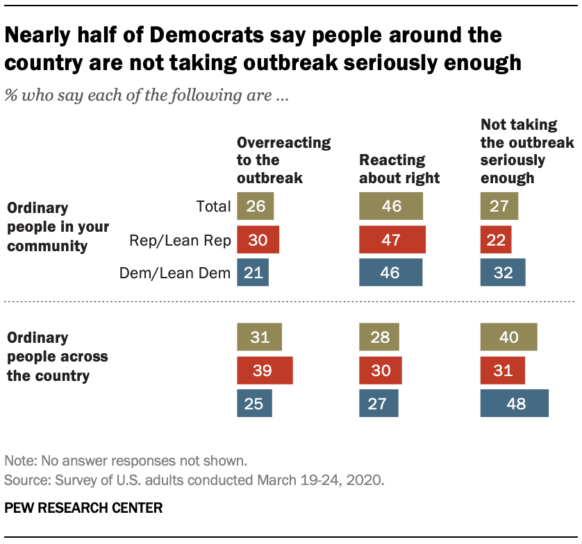 Continuing on, we can find another chart talking about the Democrats opinions on if people are taking the pandemic serious or not. Well, if the media was realistic and focused on what is important instead on what this one or that one thinks, it may be taken more seriously. While looking at the chart, you can see that this is again what the Democrats and Republicans think. The problem is, not everyone is a Democrat and not everyone is a Republican. There are people who don’t chose a side. So here, we are just leaving out their opinions and thoughts. This is unfair. Everyone should have a voice especially when it comes to a global pandemic that is life threatening to millions of individuals and is impacting every single person’s life in some way. Everyone deserves to be heard and this is not allowing that to happen.