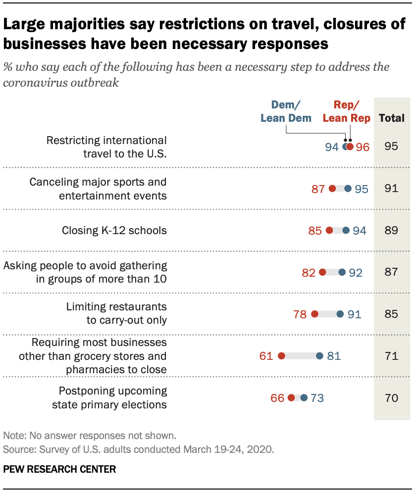 This COVID- 19 pandemic started in China and quickly began to spread to Italy and the United States. This has caused a huge travel ban. It has been a largely debated problem especially in politics between the democratic and republican parties. 94% of Democrats say it was necessary to restrict international travel to the US. While 95% of Republicans say it was necessary to cancel major sporting and entertainment events. Overall, the total percentage of necessary steps to address the corona virus outbreak has been over 70% between both parties.