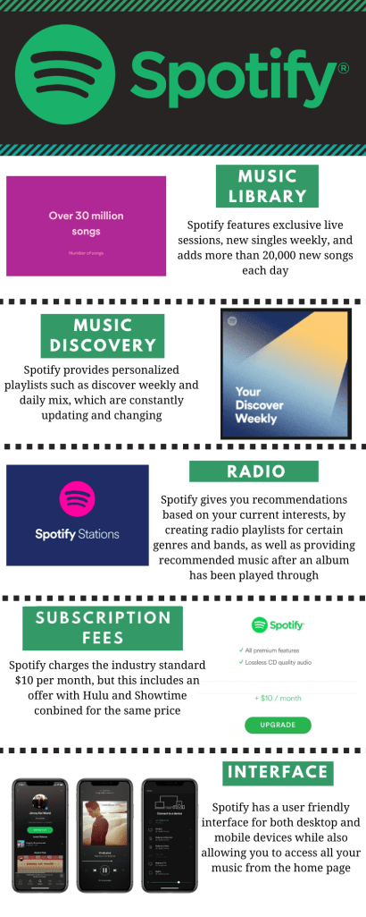 On the other hand, Spotify is a relatively new streaming service that has exploded on the market, partially due to its free music streaming with ads. Spotify allows subscription free users to create playlists and browse as well, only including limited song skips and frequent ads. This service is still appealing, especially to those who want to try the service before they decide to sink $10 a month into it. A feature unique to Spotify that provides even more of an in depth experience is its social features. “Spotify’s social functions allow subscribers to follow friends (if you’re both on Facebook and connect your Spotify accounts) and see both what they listen to and who they follow. It also gives users the ability to share or recommend playlists, along with the ability to publish their listening history to Facebook, which then gives their Facebook friends an opportunity to like or comment on the activity.”(Digital Trends) I took a Skype call with a colleague Rachael, who makes a lot of Spotify playlists for her friends and overall really enjoys the app. “I had iTunes like all my friends back when I was younger, but switched to Spotify probably 5 years ago. Being able to use it for free persuaded me to buy it eventually and I haven’t turned back. The friends thing is for sure my favorite, I follow my friends playlists and they follow mine, we constantly make these for each other too. Its a fun way to find new music.” Spotify’s social features drastically helped it become as popular as it is today, and is a distinct feature that keeps its users loyal to the brand.