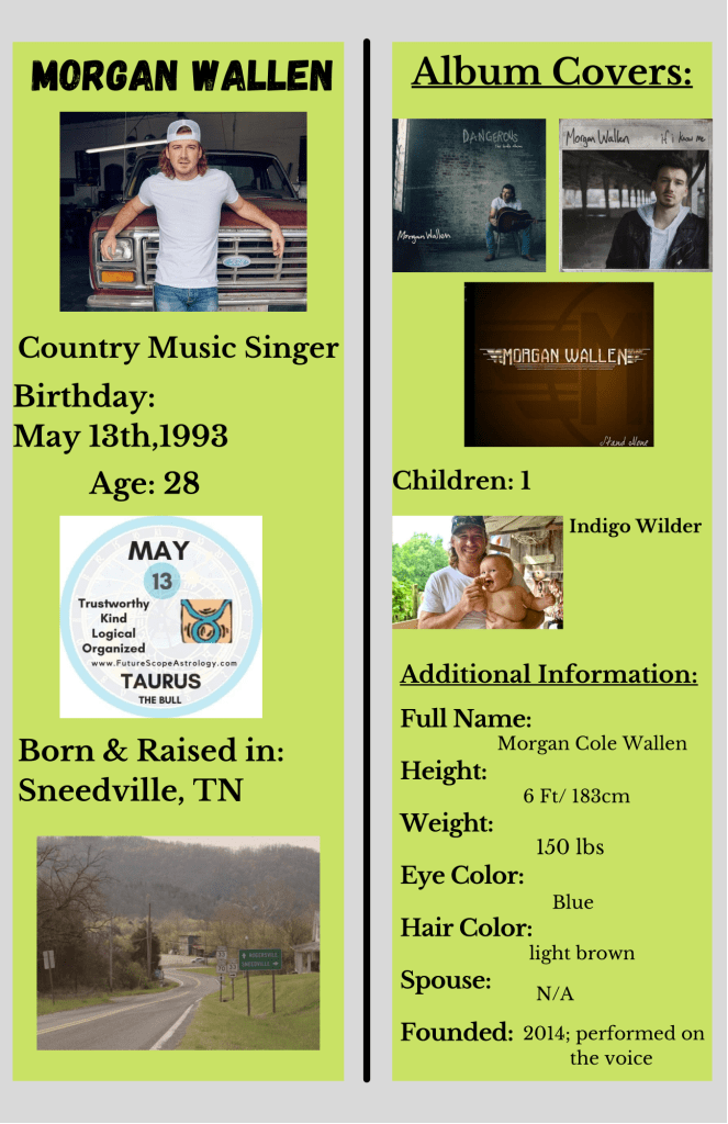 Morgan Wallen is the person I chose to do because he is a very well known country artist. It was very easy to find information on him and I am a huge fan of him so I also knew a lot of the facts stated on my infographic. On google there was so many websites that immediately popped up when I searched his name so it was very easy to find information on him. I learned more about him than I even knew before this project.