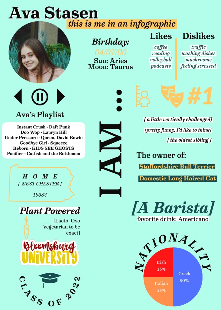 I chose myself for this project so that I could focus on the graphics and less on the information; I don’t have to research myself. It took me longer than it probably should have to create this infographic (4 hours), but I had some trial and errors with spacing, colors and template size.