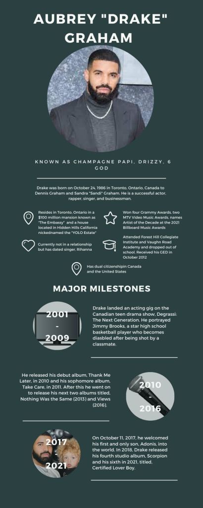 For my infographic, I decided to focus on the artist, Drake. I used the program, Canva, to complete this assignment. I have only used this program once in the past, however, it was only to create memes for a previous class. I found making an infographic was very tedious since all the lines, text boxes, etc. do not properly align when you move them. I ended up using their only biography template because I thought it was most appropriate for this assignment.