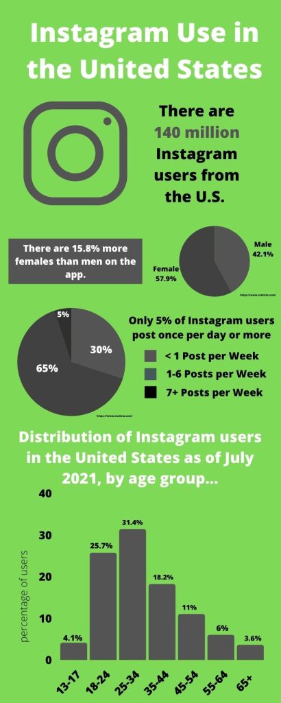 Initially, I wanted to do a general infographic about social media use in the U.S.. However, I found that focusing on one piece of social media was easier to find statistics for that could be broken down into graphs. I got all of my information from https://www.statista.com/