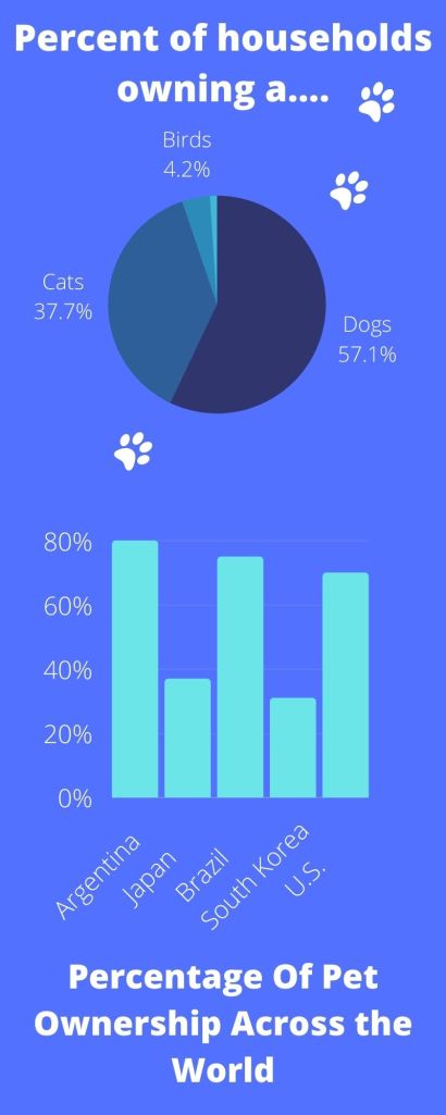 For this infographic, I researched pet statistics. I used statistics that came from the United States for my pie graph and from all over the country pertaining to the percentage of pet owners in general. My pie graph focused on the percentage of people in the U.S. owning a dog, cat, horse, or bird. The bar graph was centered around 5 countries percentages, each dealing with the country’s overall pet total.