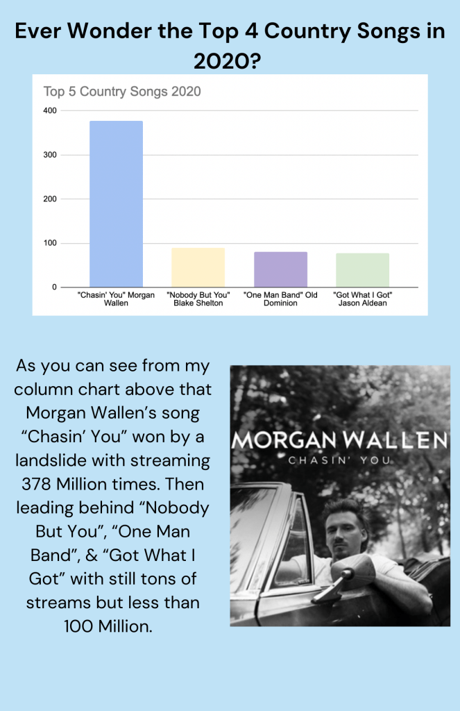 For the start of this infographic project I used google docs to create the bar chart and column chart for this assignment. I used a template then coordinated my own information in within the template itself then added in colors to organize my graph. I liked this program a lot because it was easy to navigate through and create your own with your own information. I chose to research this topic because I love country music so I thought it would be cool to search up the statistical information about it. I researched it through google and then it brought me to multiple reliable country music sites.