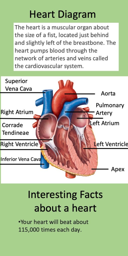 For my topic, I just researched a heart diagram, and a lot of pictures came up. I wanted to find the right infographic for my assignment. Then I had to find out where the Aorta, Apex was, etc. It took me about 15 minutes to research this topic. It took me longer to create the infographic. It probably took me about an hour to create this infographic, so about an hour and 15 minutes in total.