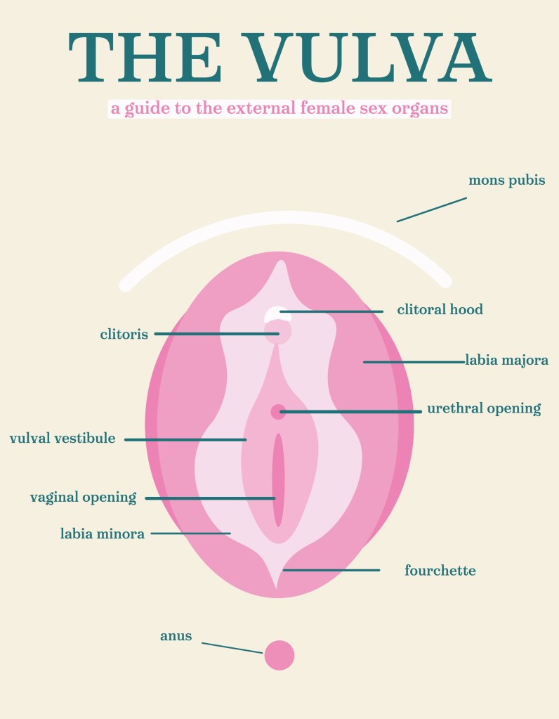 For researching this topic, I looked first at the anatomy of the vulva to decide what to label so the infographic didn’t look too crowded. Then I looked at other pictorial diagrams. I noticed right away that other diagrams typically don’t use any color and are primarily scientific illustrations. I wanted my infographic to be anatomically correct but less hyper-realistic. I chose soft colors and curved lines for these reasons. I recognize that this will never be used in an educational setting because it’s not detailed enough (there’s no real distinction between the fourchette and the labia minora) but I could see this being on Planned Parenthood’s Instagram and creating content for them is a lifelong dream of mine.