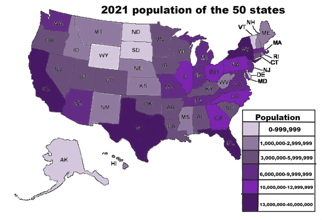 I used photoshop to create this infographic. I didn’t start from scratch because I found a template of the United States. It was my first time making an infographic during this course not using Canva to create the infographic. I liked making this infographic on photoshop but it took me a little longer than other infographics. I researched this topic by just googling the population ranking of the US states in 2021. It only took me about 10 minutes to research this topic but it took me about an hour to create the actual infographic. It took me a lot longer than I thought it would because I had some troubles with photoshop. For my design process, I first downloaded the map and imported it into photoshop. Then, I created a legend and title to add context to my map. Finally, I added the colors to each state onto the map. I chose different shades of purple for my infographic because I wanted to do shades of the same color for a monochromatic color scheme.