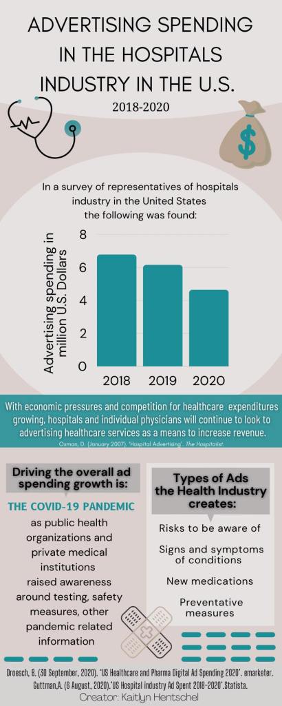 I choose to do my economic and money infographic on advertising spending in the hospital industry in recent years. It honestly wasn’t easy to find much information on this topic, you think it would be public knowledge. I personally think health advertisements are fun to learn about. This infographic took me about 2 hours to create on Canva. I choose a subtle tan background and lighter tan shapes to make the appearance “clean” and touches of teal to make it all stand out. I kept the color theme and fonts similar in order to maintain the “cleanness” of the infographic.
