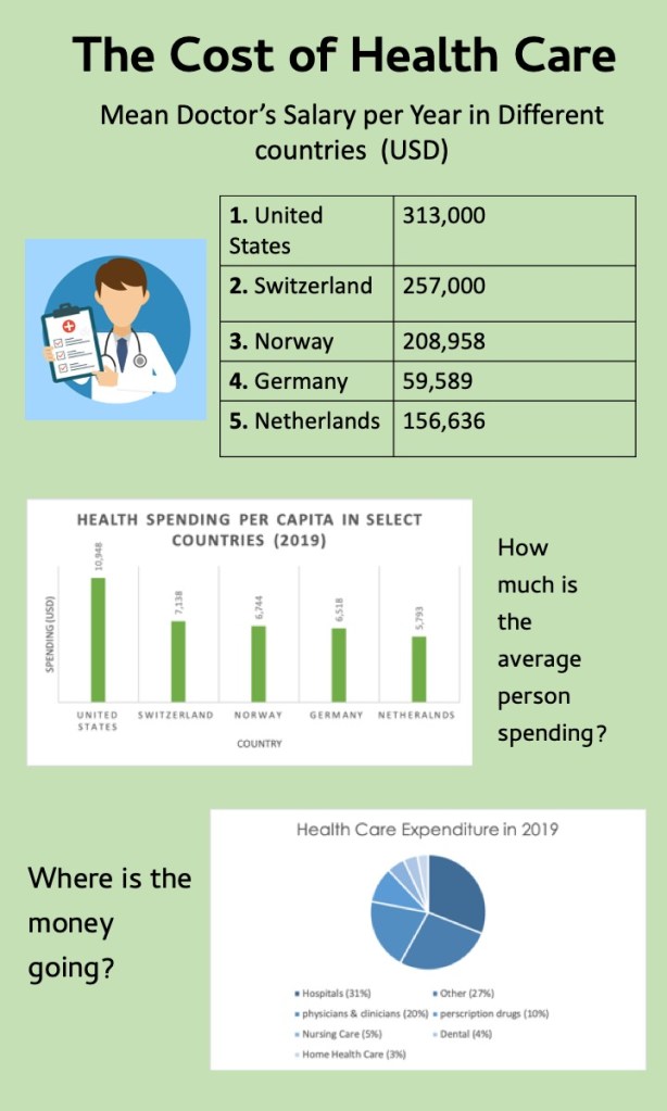 I knew that I wanted the background to be green because this weeks topic is all about money. I decided to add the Doctors salary in as a table because it helps the information to look organized. I added the cartoon picture of the doctor to help give the audience a visual. I utilized a bar graph to show how much money per year a citizen in different country spends on health care. I also used a pie graph to break down what exactly health care costs are spent on. I also used text boxes to help give a heading to the graphs and tables.