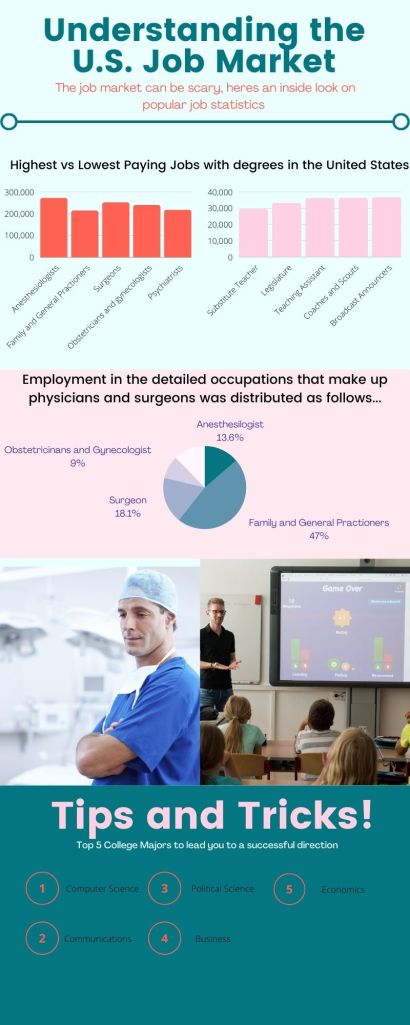 My design process started off with selecting pleasing colors. I chose blues, pinks and oranges because I felt they were neutral and subtle colors. I thought it was important to incorporate some type of picture so I chose a photo of a doctor and a teacher because of their significance to the graph above. I also thought it was important to organize my infographic in 3 sections to keep it looking structured.