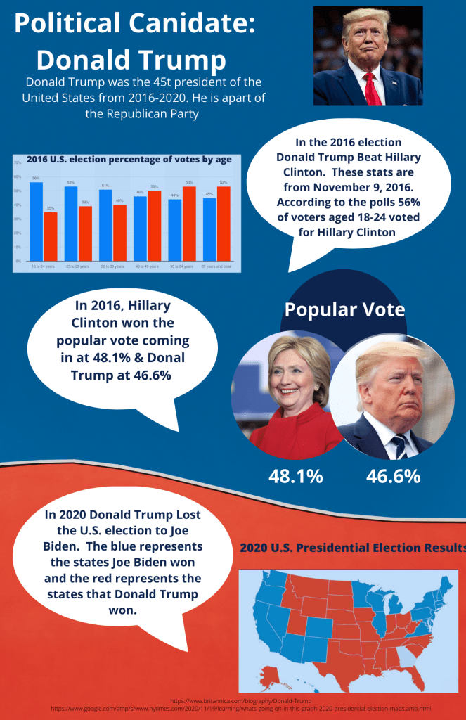 For the infographic this week I used Canva and I started from scratch for the template. I like this program because you can make it your own when starting from scratch and design it anyway you want to. There are so many tools to use that I discover every time when using Canva. This research took me by far the longest because I had to dive deep to find the information for this infographic. I googled Donald Trump and then got statistics about the past elections and information about him.