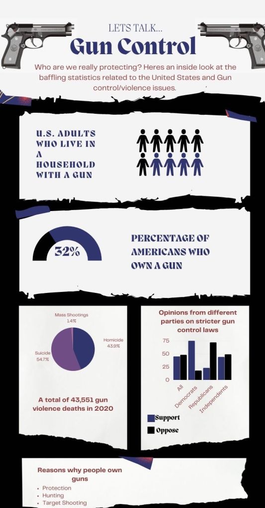 For my Politics and Election Infographic I decided to do it on Gun Control. I have continued to use Canva for my program of choice. The more I use this application the more tools and edits I pick up on. I am even considering purchasing “Canva Pro” to try out more of their tools. I started out using a template for this infographic, but ended up completing transforming it. I incorporated my own colors and designed but kept the same basic layout minus a few things.