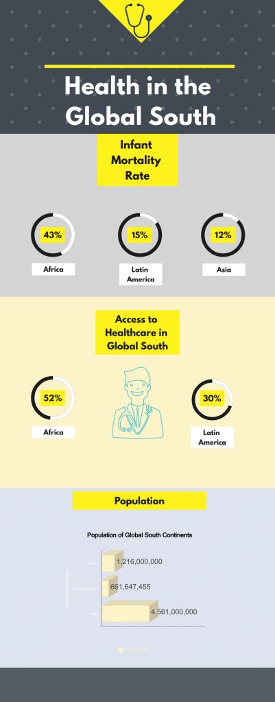 For this infographic, I created this utilizing Visme. In the graphic I used three distinct subsections of Health and Enviorments such as population, infant mortality rate, and rates of access to healthcare. These numbers driven data constituted the majority of the graph. The data was collected from two different locations, the first was Macrotrends and the second was a written work on poverty in the Global South titled “Beyond the North-South divide: The two tales of world poverty”. All in all the entire graphic took around an hour and thirty minutes to research and compile all of the data together.