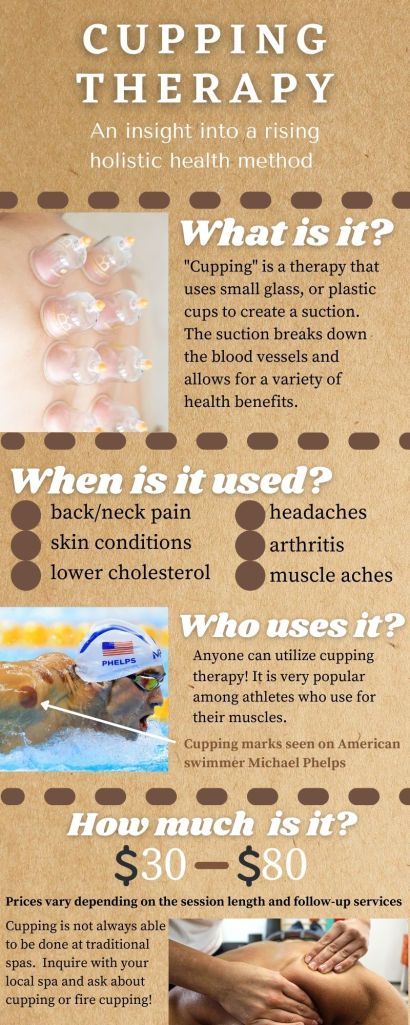 I once again used Canva to create this Infographic and I decided to focus this topic on Cupping Therapy. I have been seeing a lot of videos in the media on this type of therapy and I find it very intriguing. I wanted to cover the basics of this topic since it is not the most mainstream treatment. To do this, I focused my design process around the who, what, when, and how.