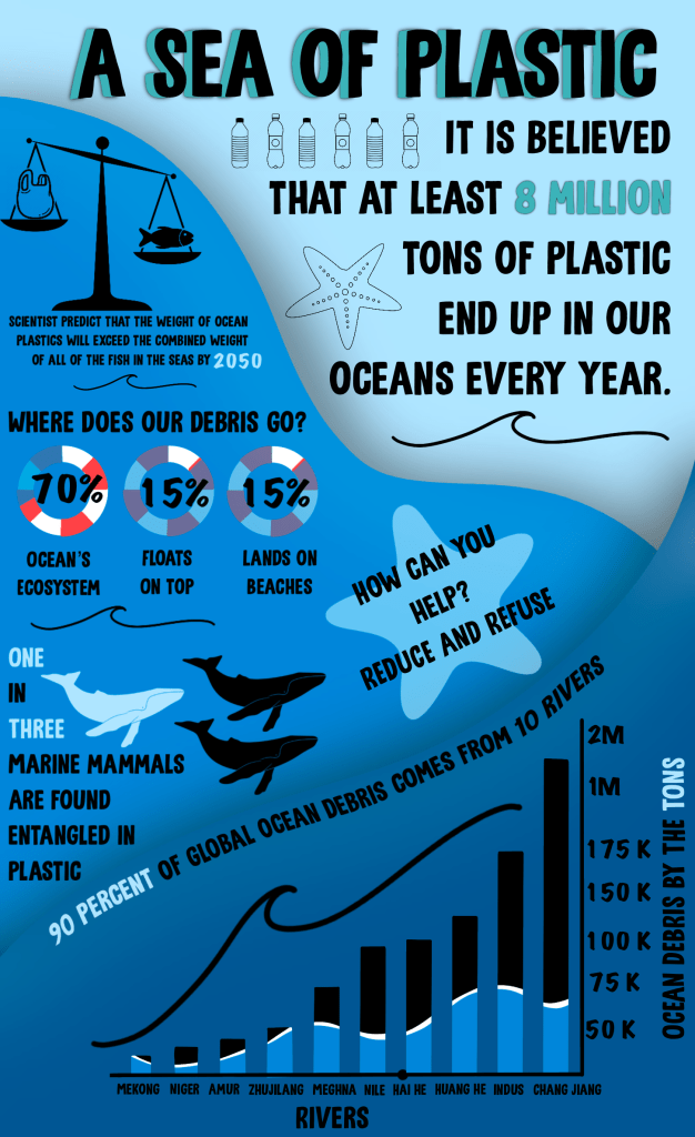 My design process started by using a big wave. I knew i did not want a lot of negative space so I tried to stack things. I liked using the lifeguard buoy for the percentages and the scale for image and insight. I am super happy with the color palette because its simpler than last week’s.