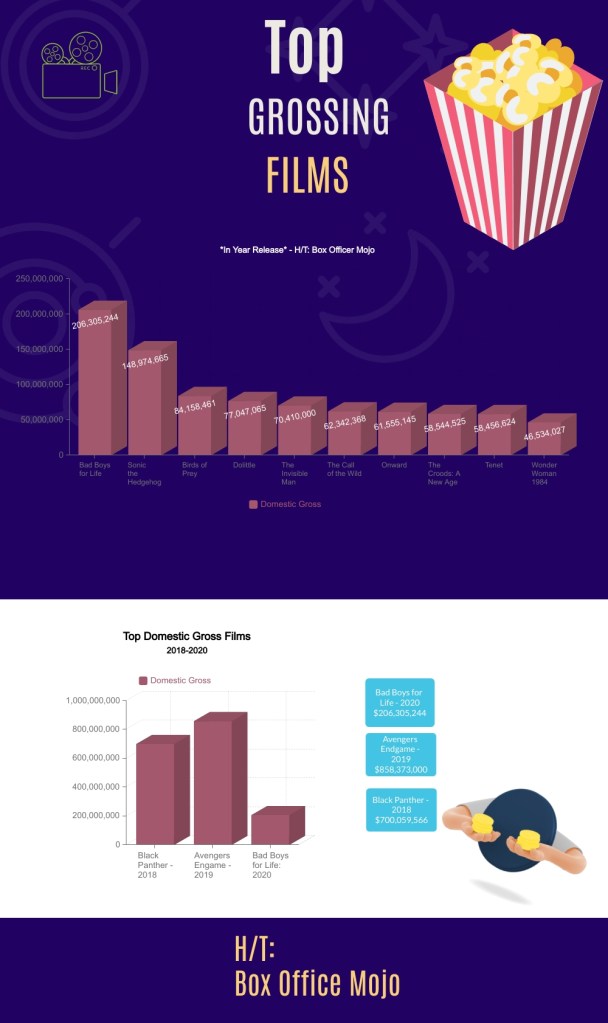 The above infographic was designed through Visme and I utilized an initial template. For the topic of Media and Entertainment, I decided to visualize the top gross domestic grossing films (in year release) from 2020 and then compare that data to the Top Grossing Films of the previous two years prior to 2020. Due to Coronavirus, you can see the stark difference in the data between 2020 and 2018/2019. The information was collected through the website Box Office Mojo for both graphs. Overall the total research time and infographic design period took around 2 hours for completion. I tried to utilize both film and movie graphics within the whole project.
