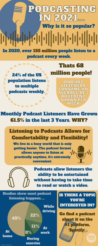 For this week’s topic of Media and Entertainment, I chose to focus on podcasts. I chose to focus on this topic specifically because I love podcasts. I listen to podcasts more than I watch TV or listen to the radio. It’s perfect for being on the go which I always feel like I am, so when I heard media I immediately thought: podcasting.
