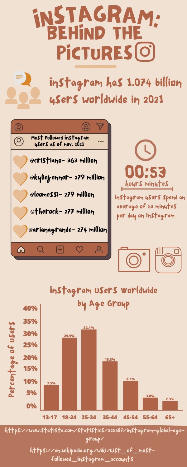 I once again used Canva to create my infographic. I had a lot of different ideas about what I wanted to do, but I thought doing the statistics behind Instagram would be interesting. Instagram is one of my favorite apps, and it’s super popular amongst my age group. There was surprisingly a lot of current statistics and information regarding Instagram. This only took me about 30 minutes to research, then about 2 hours give or take to create. I can tell that I’m getting more comfortable with using Canva. The first infographic I did probably took me 6 hours, but now that I know where everything is, it makes the process a lot smoother.