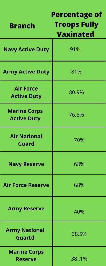 I think this infographic falls under number 5 because it talks about how Military vaccination rates are higher than those of the general population in the United States. Since Military vaccination rates are higher than the general population of the U.S.A, I wanted to make a table showing what percentage of each branch of the Military is fully vaccinated.