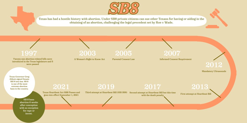 This infographic could go after paragraph 12 or 13. It is made to explain (simply) what SB8, or Texas’ abortion law is, and how it came to be. Texas has had a hostile history with abortion and SB8 has been the end goal of conservative legislators for some time.