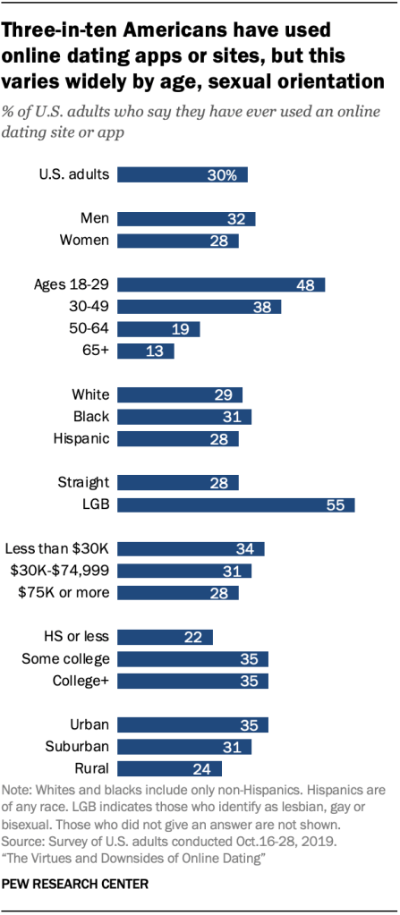 There are many statistics and opinions throughout this article that surprised me. One of the most interesting that topics I had not thought of before is the LGBTQ+ community’s usage and thoughts in regard to online dating. About 50% of LGB adults have used dating apps in comparison to 28% of straight adults. According to a different article posted by the Pew Research Center entitled Lesbian, Gay and Bisexual Online Daters Report Positive Experiences – but also Harassment, this increase in LGB usage on online dating apps is possibly due to the smaller dating pool of those seeking same sex partners.