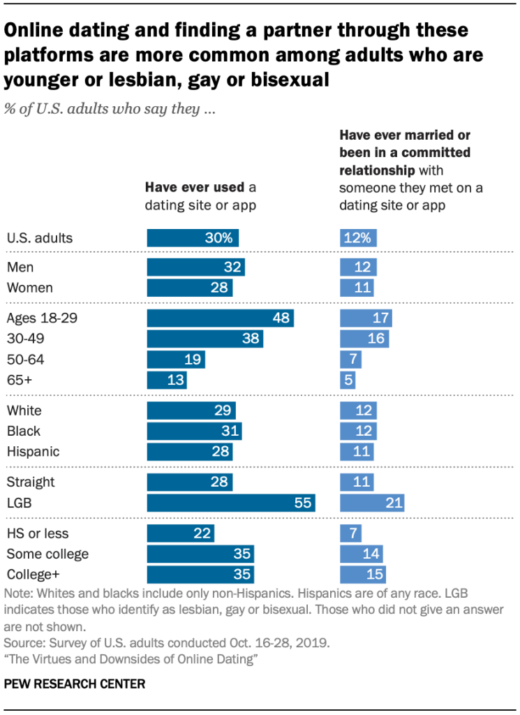 Statistically, 44.2 million Americans are using online dating while 26.6 million are using online dating through smartphone applications such as Bumble and Tinder. According to the Pew Research Center, it is estimated that 30% of Americans have used a dating app or service. On top of that, of that 30%, 11% say they have used that service in the last year. From dates to real relationships, 23% of Americans responded that they in fact went on a date that was done through online dating. Of real relationships cultivated from online services, 12% have been either in a committed relationship or have even been married as a result of professional matchmaking. These numbers go much deeper though, 48% of US adults 18-29 and 30% of 30-49 are active with online dating while the percentage of them reaching committed relationships from this service is between 16-17% respectively.