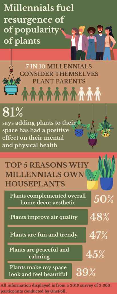 According to a millennial-based survey on Articulate, 70% (1,400 participants out of 2,000) consider themselves a plant parent. Although it is a small survey sample; I think we can agree plants have made their way into so many young individuals’ hearts, interests, and homes more than they ever have before. It could be for several reasons, personally; I think plants make my home feel like home. Taking care of my plants, buying new ones, finding fun pots- I love it all.