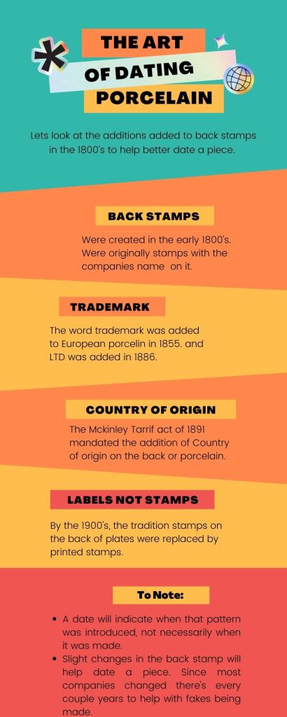 As time went, the art of handcrafting porcelain went away. And the rise of factory produced porcelain came to be. This is typically why porcelain made after the 1800’s doesn’t hold the same value as that of pieces made before that time. However, each set has its own historically based significance along with reasoning behind things like its patterns, colors, shapes and sizes, mineral build, and stamps. And hopefully will raise the question: Should I appreciate that set in grandma’s cupboard just a little more? And should we maybe get them down and use them every once in a while, even though they need washed by hand? And who knows, maybe if you ask her, she’ll even be able to teach you a little about that set herself, and the personal history it has for her.