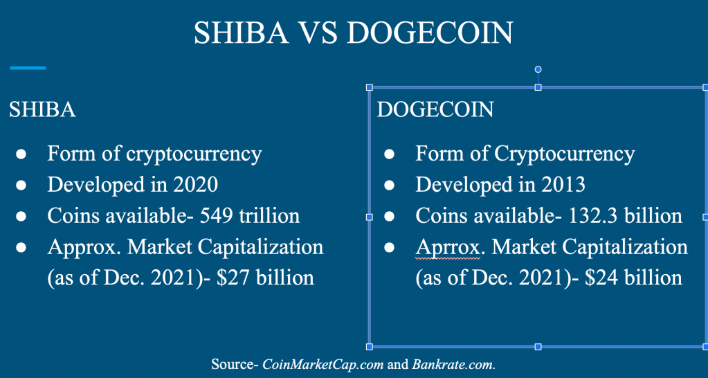 The only infographic I truly had to look outside of the story for information was the first one I made. For this I googled how Shiba and Dogecoin compared to each other. I took the information I found on Bankrate.com and compiled it into one side-by-side slide. The other two, however, came from information found within the article.